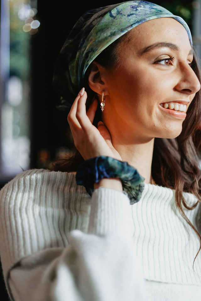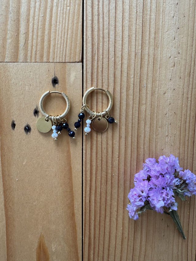 Boucles Sedna — perles naturelles et nacre blanche, avec pendentifs en acier inoxydable sur créoles dorées.