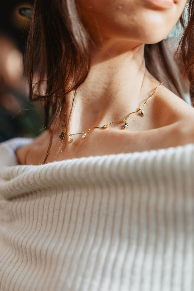 Collier Sedna — chaîne vague en acier inoxydable, perles turquoise et nacre blanche, agrémenté de mini charms inoxydables.