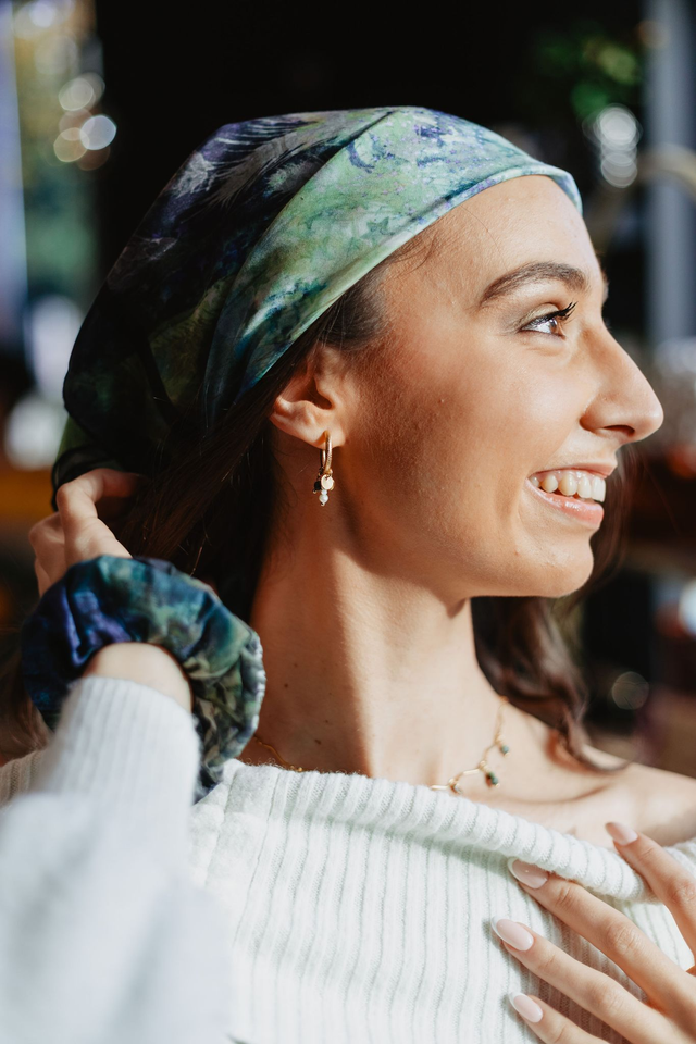 Parure complète Sedna : collier en acier inoxydable, perles naturelles, nacre. Boucles créoles martelées en acier inoxydable, pendants en perles naturelles et nacre.
