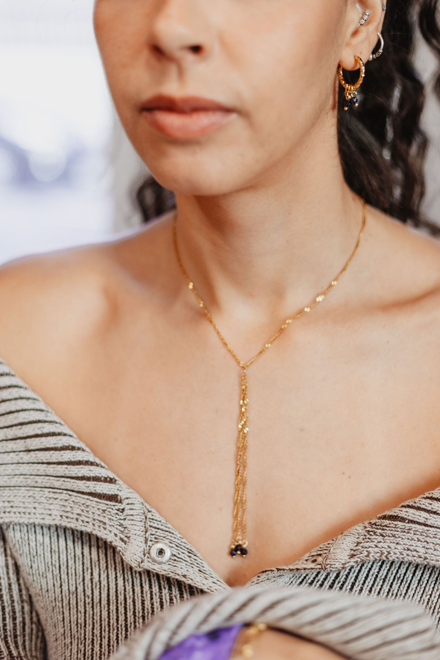Boucles RAN — trois perles Blue Sandstone sur acier inoxydable doré.